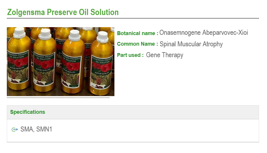 Zolgensma Preserve oil Solution are Raw material product a good source of Antiviral Vaccines, bioactive compounds comprising flavonoids, alkaloids, phenolic compounds, saponins and tannins, protein, carbohydrate, lipids and fibre, Diabetics, Tuberculosis and Animal Injections and also dissolving of fats in human body and other pharmaceutical tablets. Required by Pharmaceuticals company for research and development.